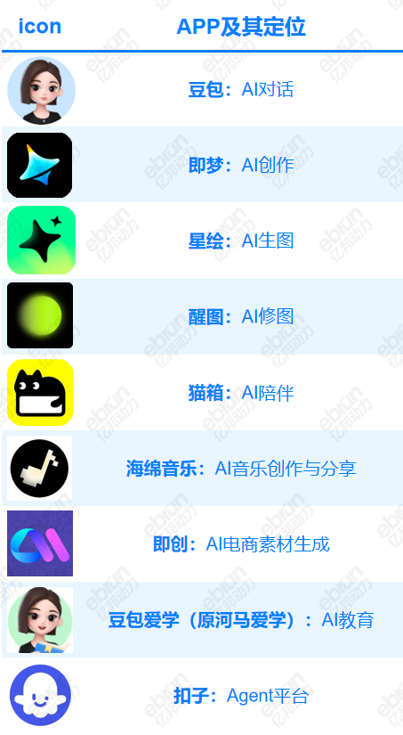 字节则敢于在商业模式不清晰时,探索所有应用场景:推出“豆包”对标“ChatGPT”、“即梦”对标“Sora”、“星绘”对标“妙鸭相机”、“醒图”对标“Midjourney”、“海绵音乐”对标“Suno”、“猫箱”对标“Talkie”(MiniMax陪伴产品)、“扣子”对标“Dify”(智能体平台),还有河马爱学(教育)、小悟空(办公)、即创(电商内容创作)、CodeGen(代码)等产品,同时所有AI应用均有相应的海外版本。