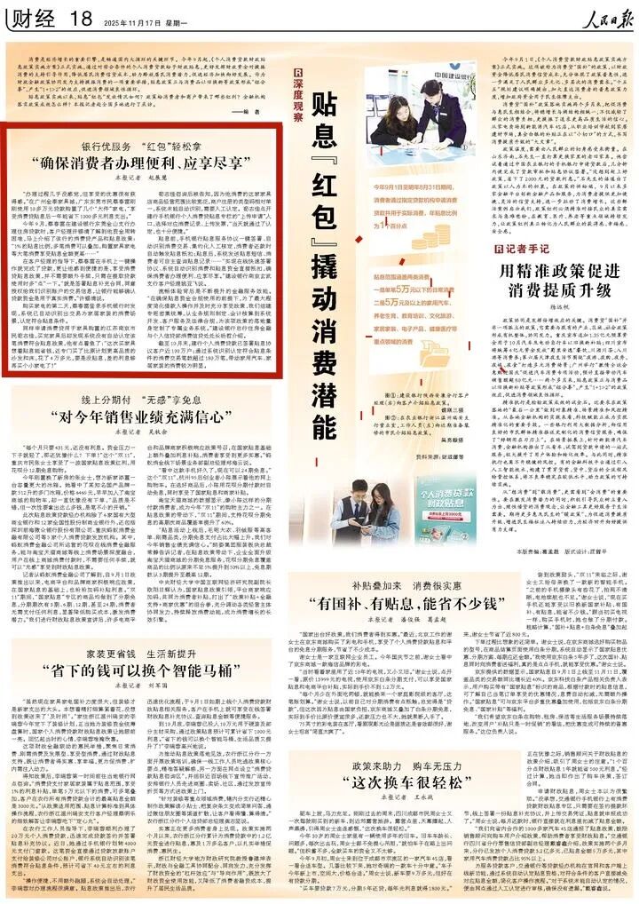 近期,建设银行举办“提振消费促发展”媒体主题调研采访活动,邀请媒体记者走进建行,见证金融赋能消费的鲜活场景,直观感受建行在激发消费活力中的实干作为。今日《人民日报》专版刊发《贴息“红包”撬动消费潜能》,报道建行积极贯彻落实个人消费贷款财政贴息政策,确保办理便利,推动政策红利惠及消费者。“今日建行”转载如下: