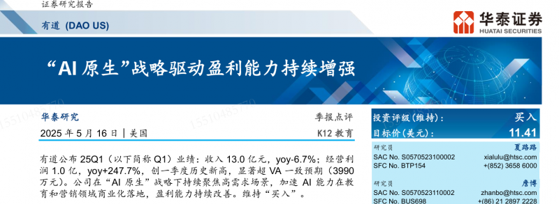 (原标题:Q1经营利润创历史新高正规股票配资门户网站,华泰证券维持有道“买入”评级,目标价11.41美元)
